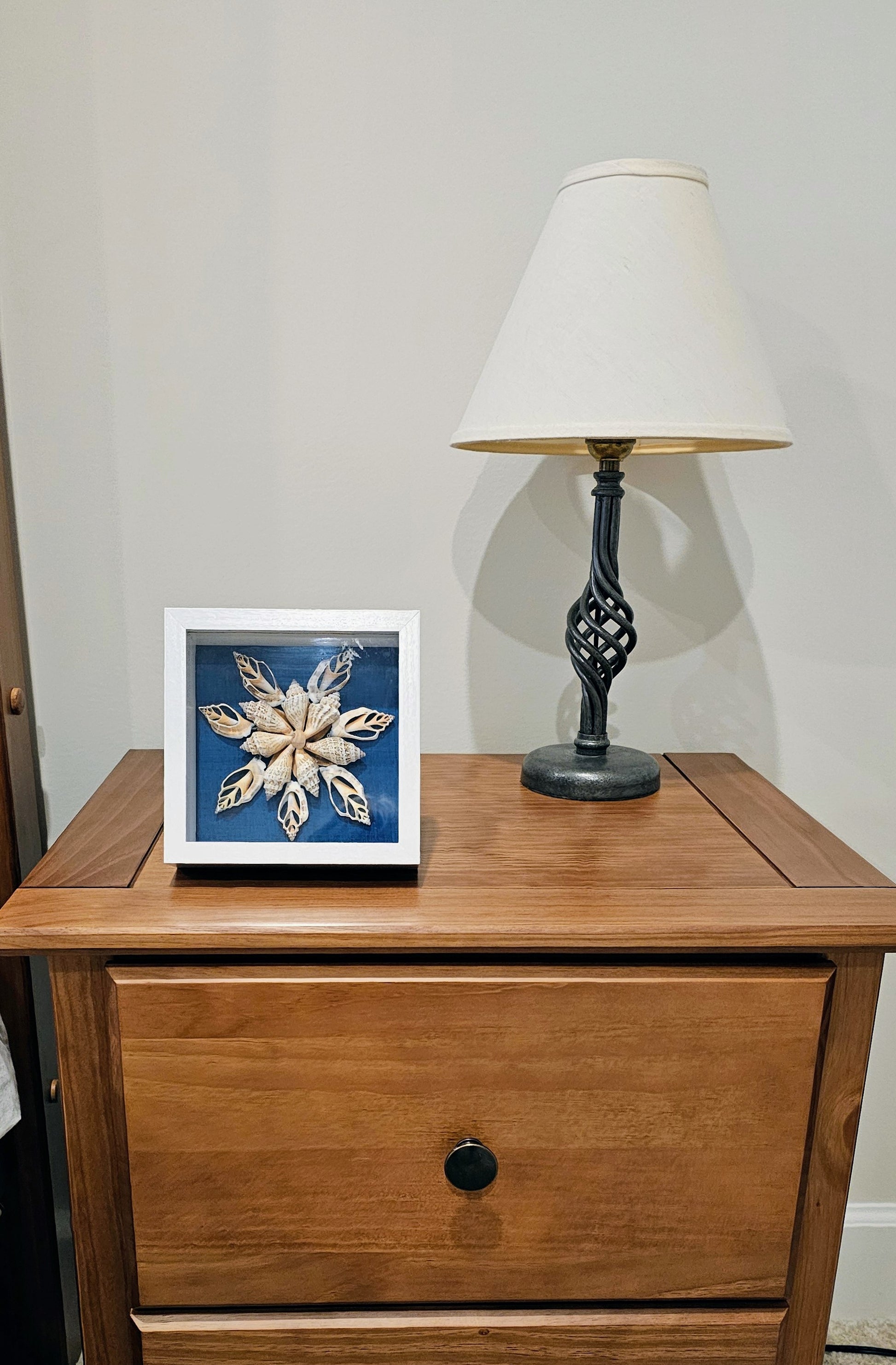 Actual artwork is 5x5 in a 5.5x5.5 white wooden frame with a dark blue fabric background