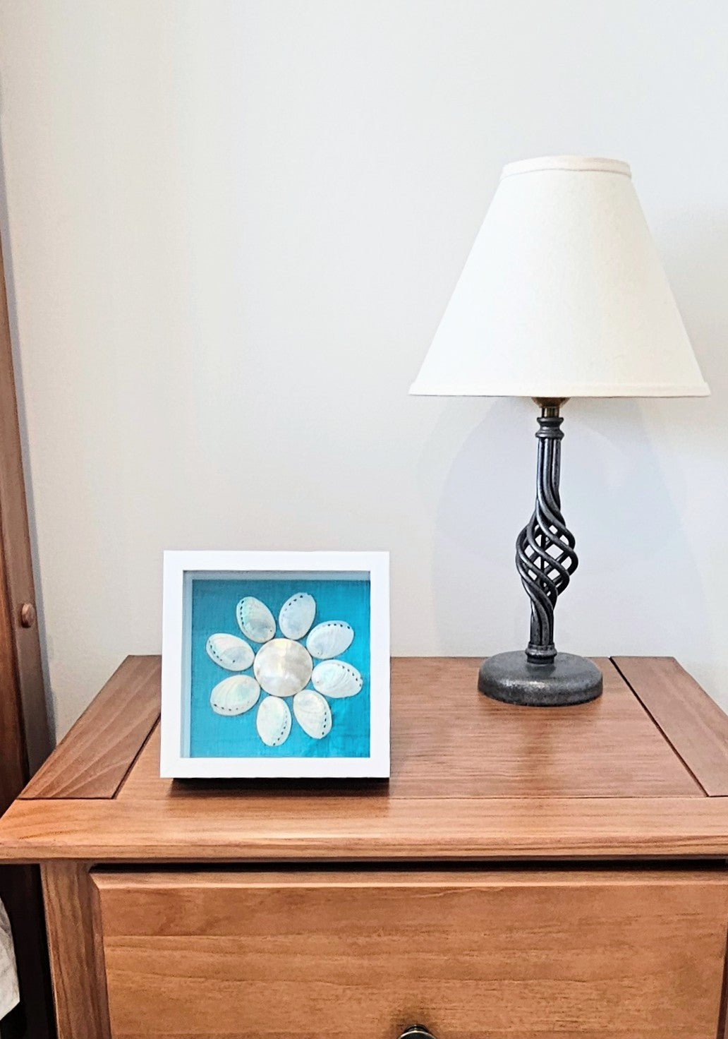 Actual artwork is 5x5 in a 5.5x5.5 white wooden frame with a blue fabric background