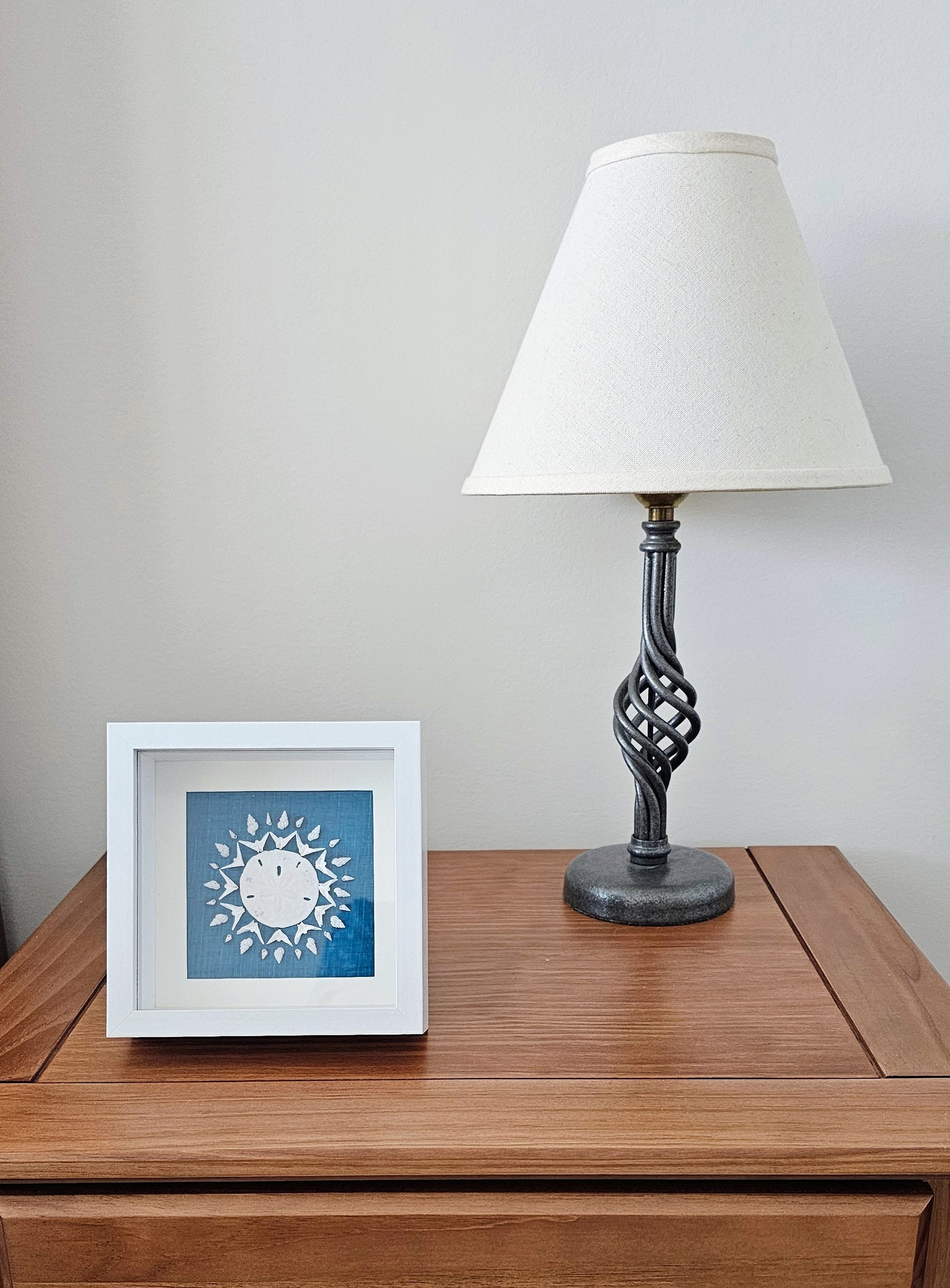 Actual artwork is 3.5x3.5 in a 5.5x5.5 matted white wooden frame with a stormy blue fabric background