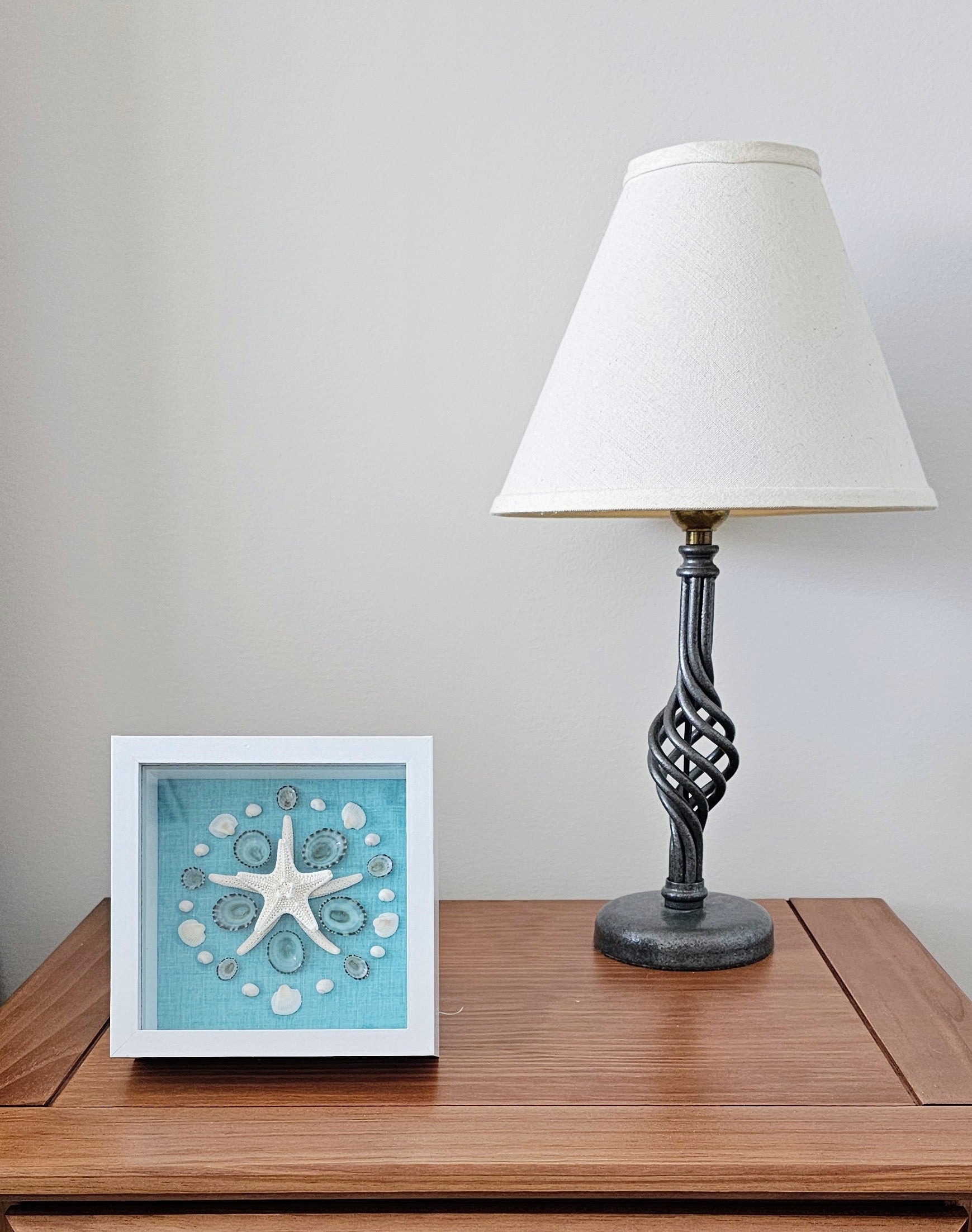 Actual artwork is 5x5 in a 5.5x5.5 white wooden frame with an ocean blue cloth background.